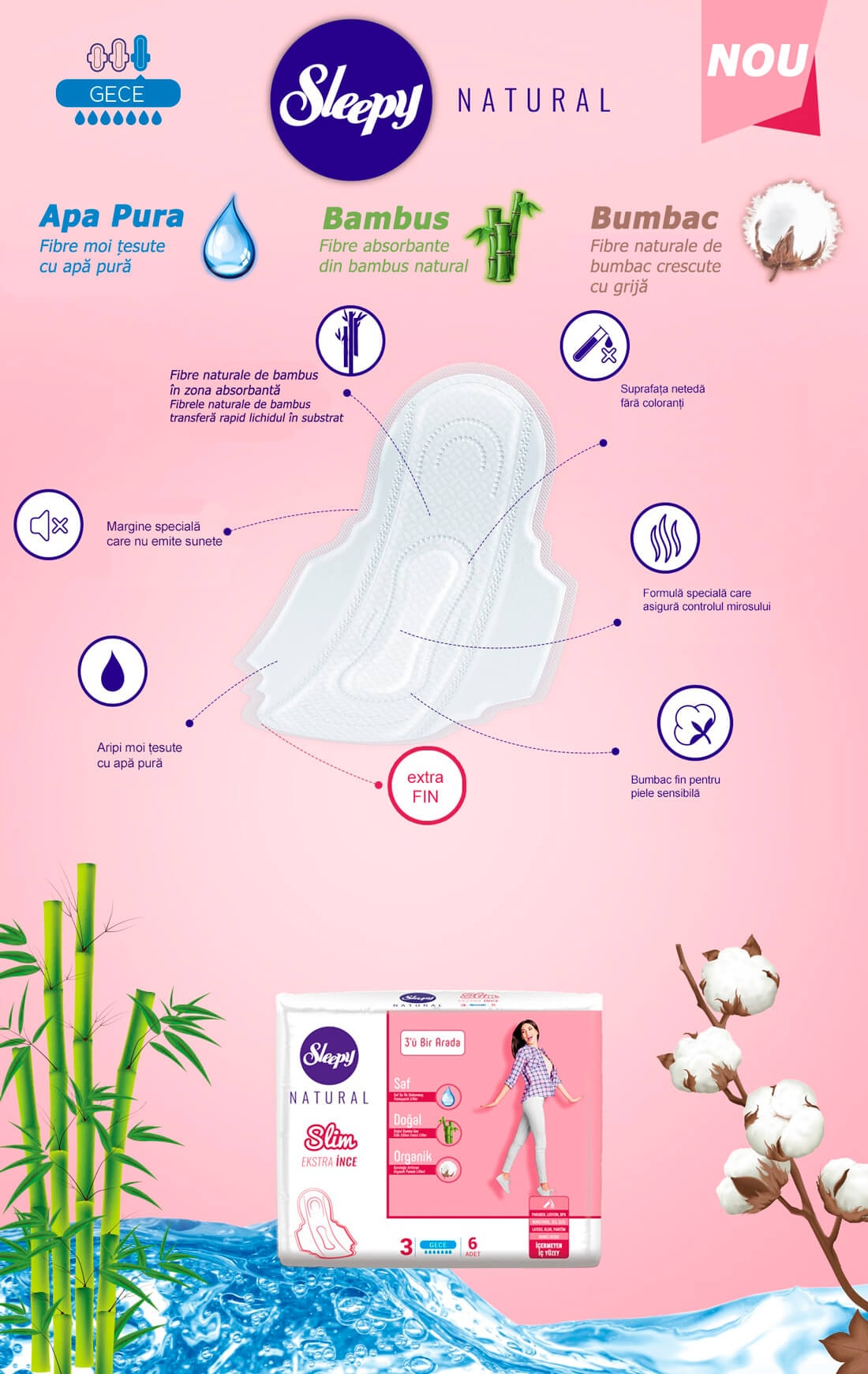 Absorbantele Sleepy Natural Slim sunt create din fibre de bambus pentru a asigura un confort maxim pentru pielea dumneavoastra delicata in zilele speciale.