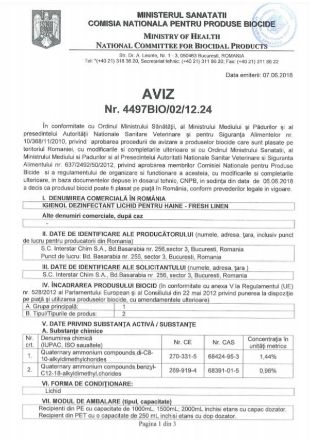 Igienol Virucid Dezinfectant lichid pentru haine Fresh Linen 100ml, avizat Ministerul Sanatatii