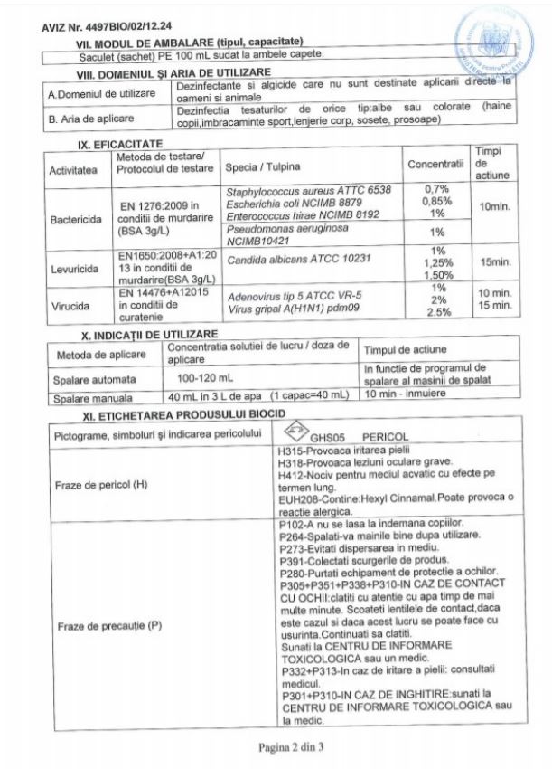 Igienol Dezinfectant Lichid pentru haine 100 ml este un aditiv care dezinfectează hainele, nu conţine clor, fiind eficient chiar şi de la 20°C. Igienol distruge 99.9% din bacterii (Staphylococcus aureus, Pseudomonas aeruginosa, Escherichia coli, Enterococcus hirae), virusurile (Adenovirus, AH1N1) şi fungii (Candida albicans).