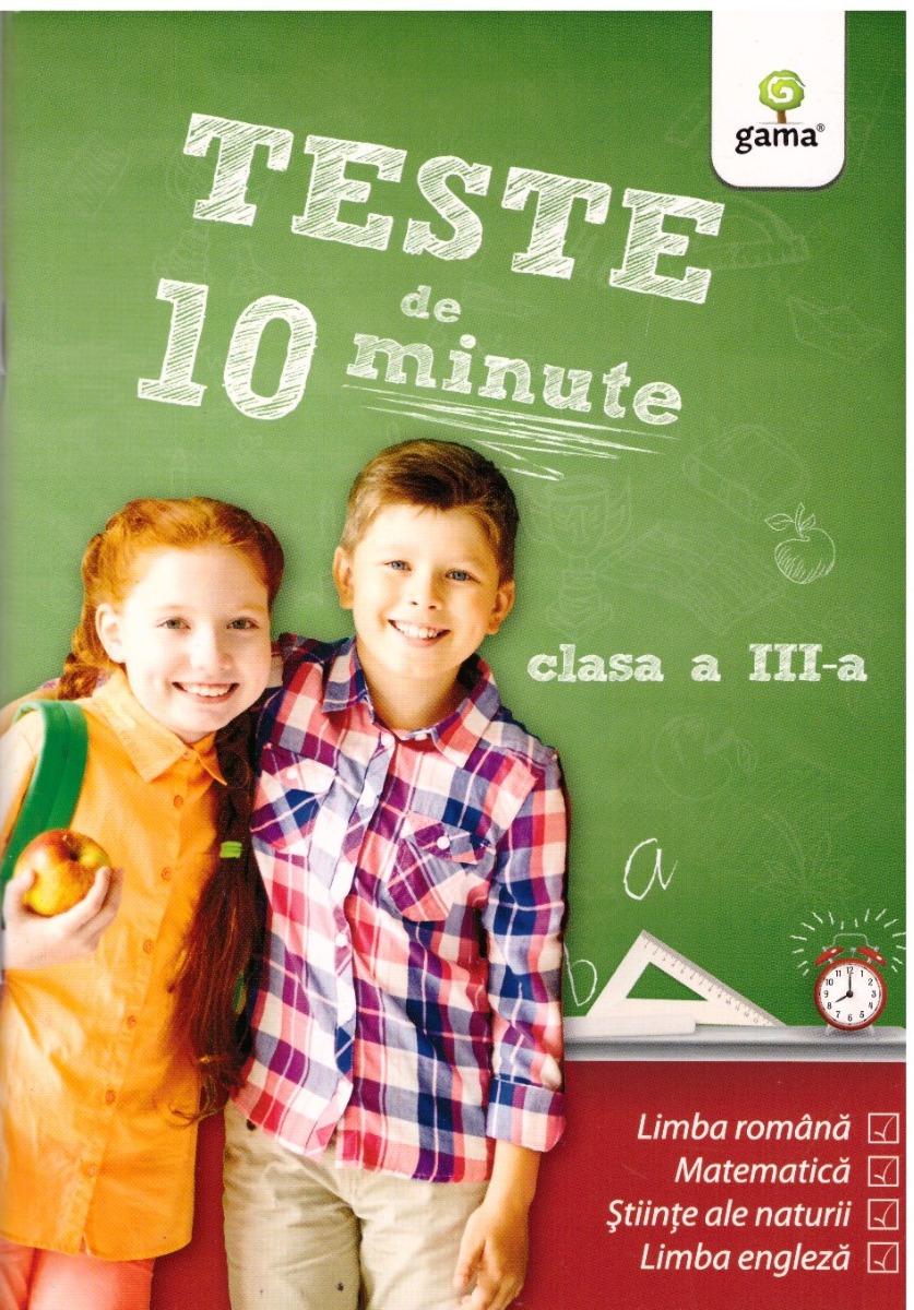 Caietul Teste de 10 minute. Clasa a III-a urmareste exersarea notiunilor invatate si evaluarea cunostintelor dobandite la orele de matematica si stiinte ale naturii, limba si comunicare si limba engleza. Pentru fiecare test exista cate un barem de punctaj, iar raspunsurile la teste se regasesc la finalul caietului.
