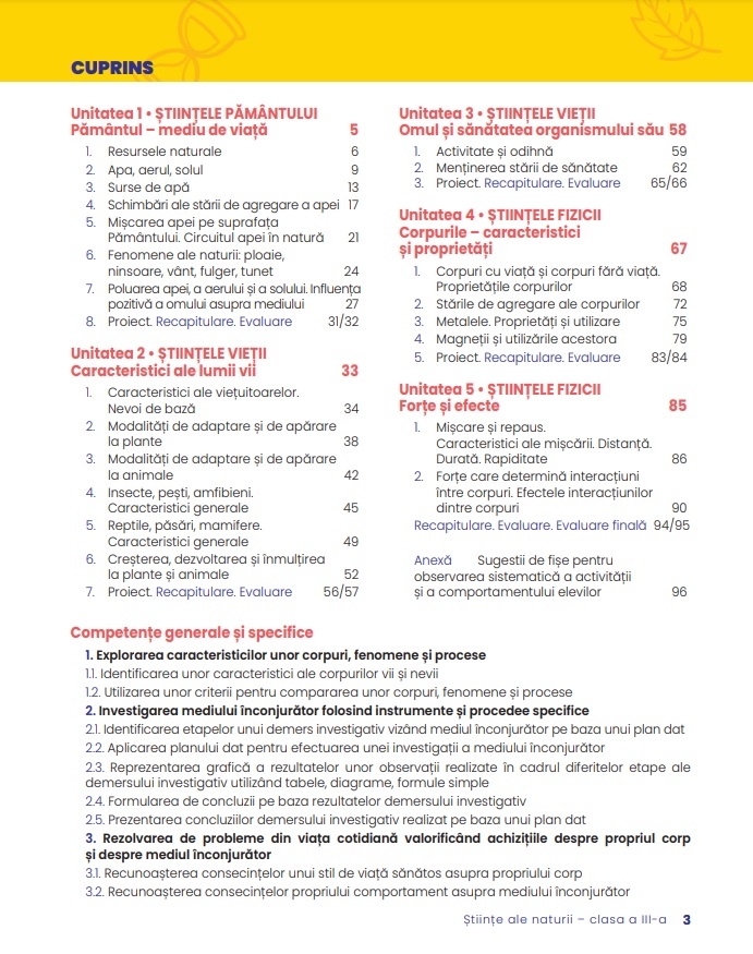 Manualul respecta integral continuturile prevazute de programa scolara in vigoare si este structurat in cinci unitati de invatare (Pamantul – mediu de viata, Caracteristici ale lumii vii, Omul si sanatatea organismului sau, Corpurile – caracteristici si proprietati, Forte si efecte).