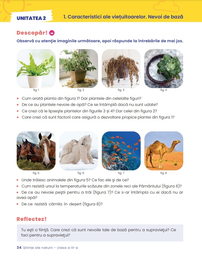 Manualul beneficiaza de un bogat continut vizual, reprezentat de fotografii care surprind aspecte din realitate sau de imagini care reproduc cat mai fidel realitatea, obiectivul fiind acela de a-l sprijini pe elev in intelegerea si respectarea mediului inconjurator.