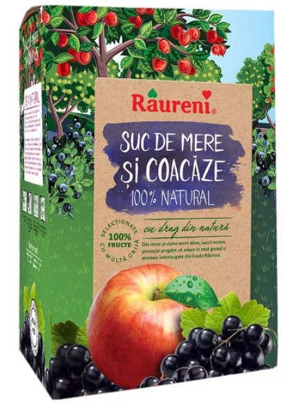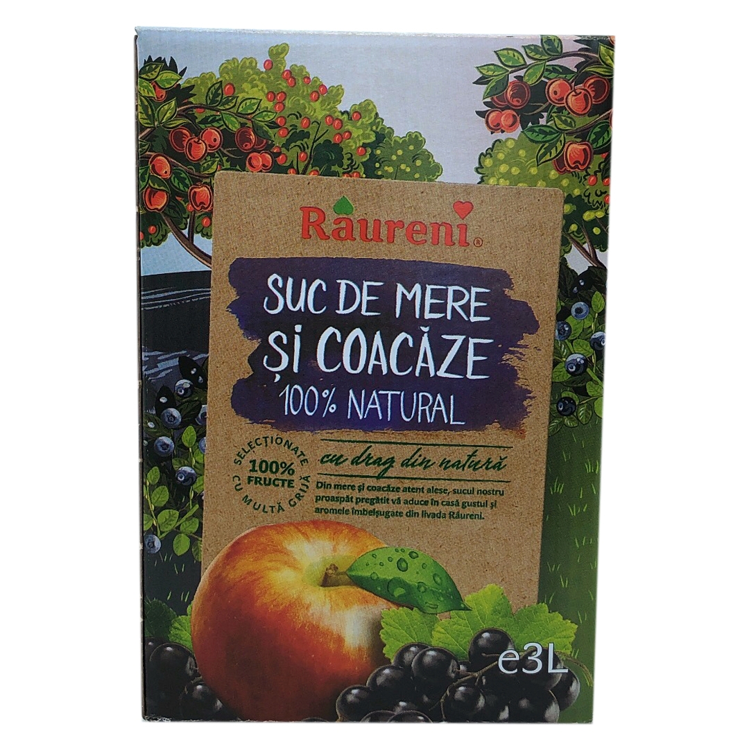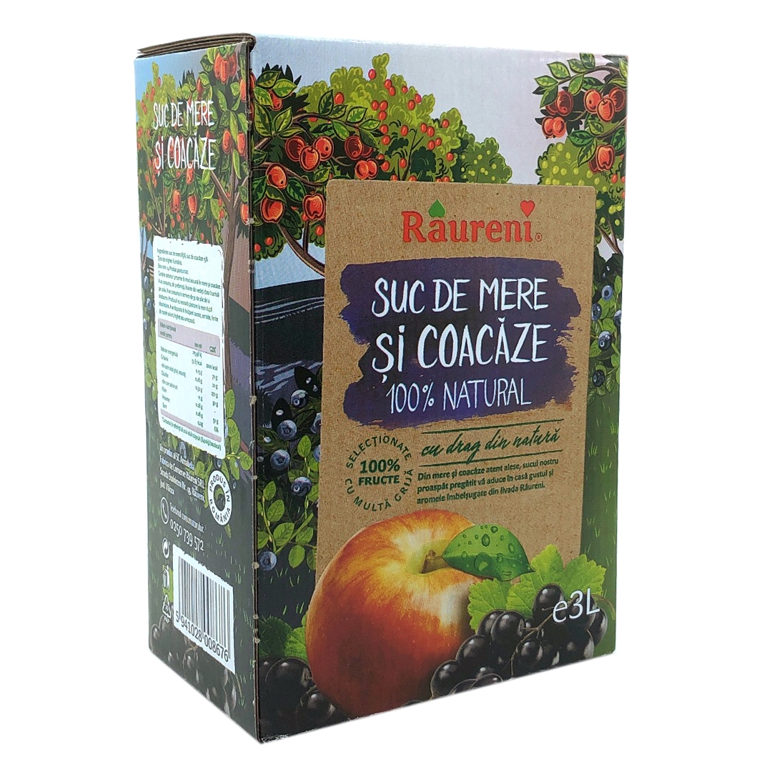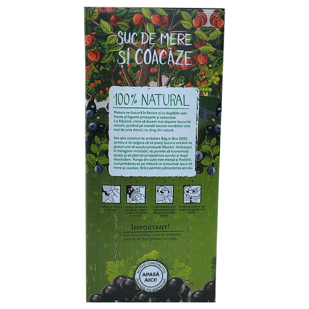 Ingrediente: 85% suc de mere, 15% suc de coacaze. Contine zaharuri prezente in mod natural in mere si coacaze.