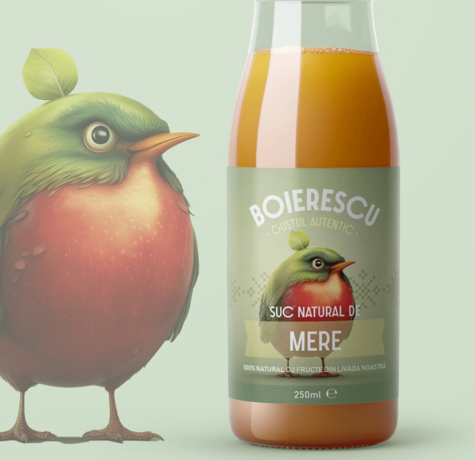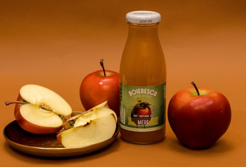 Gustul autentic al sucului de mere – o expresie pură a bogăției și diversității fructelor crescute cu dragoste în livada Boierescu.