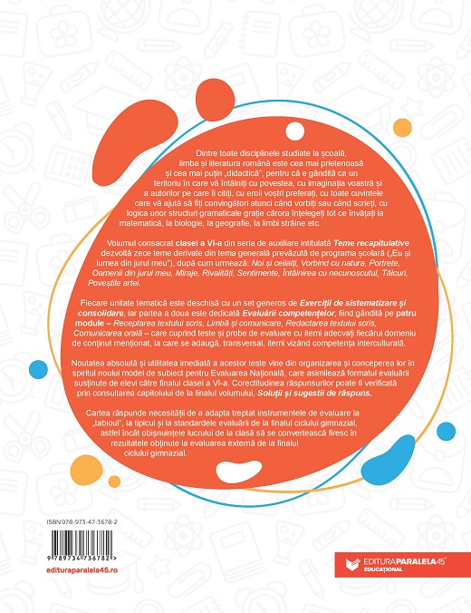Fiecare unitate tematica este deschisa cu un set generos de Exercitii de sistematizare si consolidare, iar partea a doua este dedicata Evaluarii competentelor, fiind gandita pe patru module – Receptarea textului scris, Limba si comunicare, Redactarea textului scris, Comunicarea orala – care cuprind teste si probe de evaluare cu itemi adecvati fiecarui domeniu de continut mentionat, la care se adauga, transversal, itemi vizand competenta interculturala.