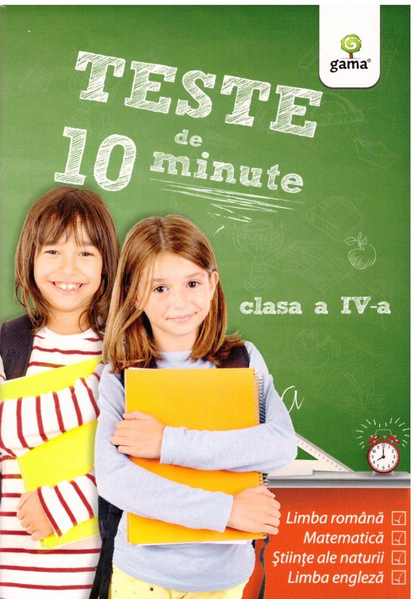 Caietul Teste de 10 minute. Clasa a IV-a urmareste exersarea notiunilor invatate si evaluarea cunostintelor dobandite la orele de matematica si stiinte ale naturii, limba si comunicare si limba engleza. Pentru fiecare test exista cate un barem de punctaj, iar raspunsurile la teste se regasesc la finalul caietului.