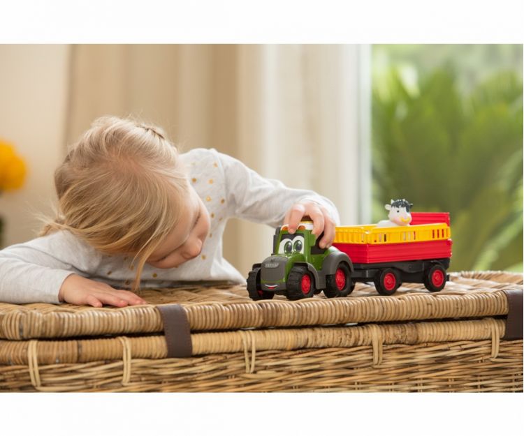 Tractoras cu remorca pentru bebelusi, cu licenta Fendt, cu sunet si lumina, si vacuta inclusa. Ridicati-va manecile - chiar si mainile copiilor mici pot apuca bine tractorul si, datorita functiei de roti libere, pur si simplu il imping inainte si inapoi. Acum lucrarea poate veni! Tractorul cu roti libere ofera o experienta unica de joaca pentru toti iubitorii de ferma. Datorita dimensiunii impreuna cu functia de lumina si sunet, precum si a remorcii pentru animale, inclusiv o figurina vacuta, sunt oferite dimensiuni de joc complet noi. Pentru a sprijini dezvoltarea celor mai tineri, exista parti in miscare, precum si lumina si sunet - ideale pentru promovarea abilitatilor motorii din prima copilarie. Desigur, tractorul este rezistent la culoare, rezistent la saliva, fara piese mici care ar putea fi inghitite si cu colturi rotunjite.