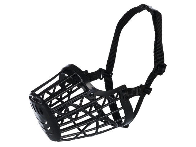 Botnita confectionata din plastic. Impiedica muscatura. Cu curea din nailon, reglabila complet.
