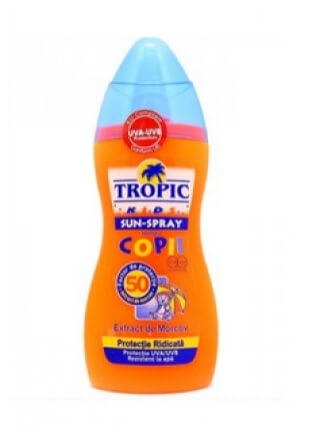 Protejeaza-i pe cei mici de radiatiile solare cu Protectia solara pentru copii Tropic SPF 50, 200 ml cu extract de morcovi.