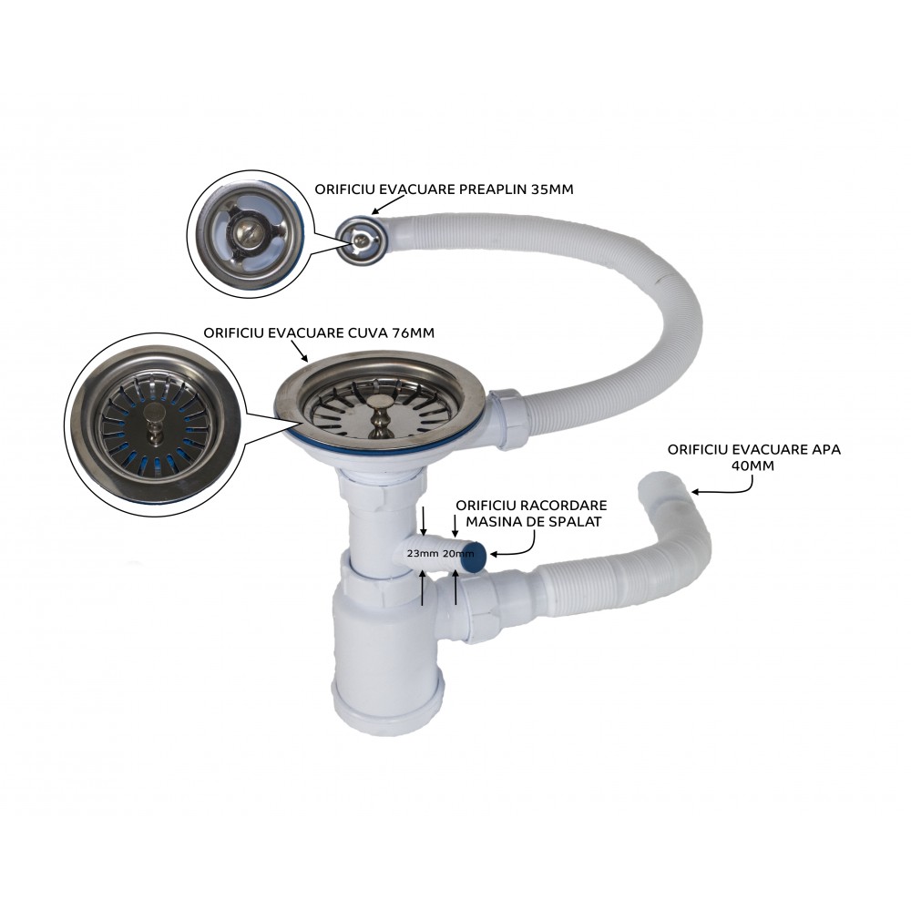 Setul livrat va contine un tub cu silicon de montare/impermiabilizare si sifonul (inox) complet, gata de folosit.