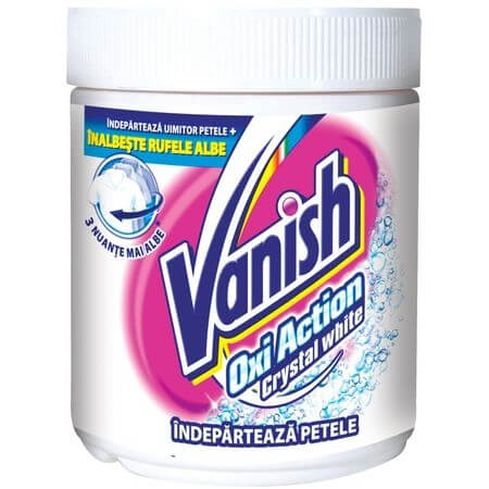 Vanish White inalbeste rufele albe la fiecare spalare, cu pana la 3 nuante mai albe fata de cele innegrite (rezultatele pot varia). Nu afecteaza tesaturile albe. Functioneaza chiar si la 30 grade Celsius.
