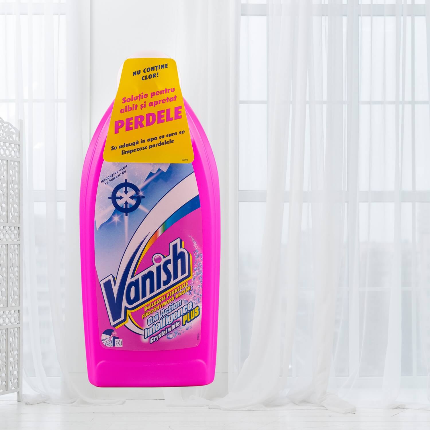 Detergentul lichid pentru perdele Vanish este ideal pentru perdelele din plasa, tul sau dantela. Adaugati acest aditiv in apa in care se limpezesc perdelele pentru a le inalbi si apreta.