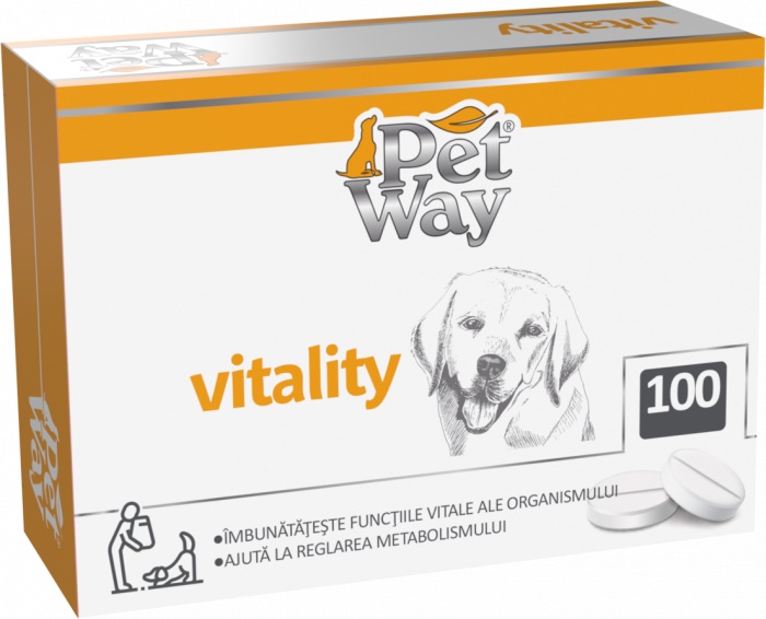 PetWay Vitality - hrana complementara cu polivitamine, microelemente si carnitina pentru caini, cu o gama larga de recomandari, dar in special pentru cresterea imunitatii si vitalitatii cainilor.
