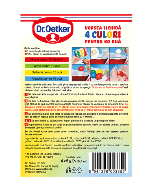Sugestii de utilizare si/sau precautii (Mentiuni legale) Instructiuni de utilizare: se spala si se degreseaza ouale, cu detergent de vase, apoi se clatesc bine si se fierb la la foc mic cu grija ca sa nu se sparga. Ouale nu se fierb in vopsea! Veti obtine culori deosebite folosind oua albe. Se detaseaza fiecare plic folosind o foarfeca. Intr-un vas de circa 1.5l se toarna cu grija 700ml de apa clocotita, apoi se goleste continutul plicului si se amesteca bine. Se adauga 5 linguri de otet de 9 grade. Atentie: otetul este foarte important in fixarea culorii pe coaja oualor. Daca otetul folosit are concentratia mai mica de 9 grade, mariti cantitatea de otet adaugata. Se scufunda atatea oua fierte in solutia de vopsea cat sa poata fi complet acoperite de lichid, apoi se lasa in repaus, pana se obtine nuanta dorita (2-4 minute). Se scot cu ajutorul unei linguri. Ouale se lasa la uscat pe un prosop de hartie. Dupa dorinta, ouale se pot unge cu putina grasime sau ulei. Astfel vor capata un luciu deosebit.
