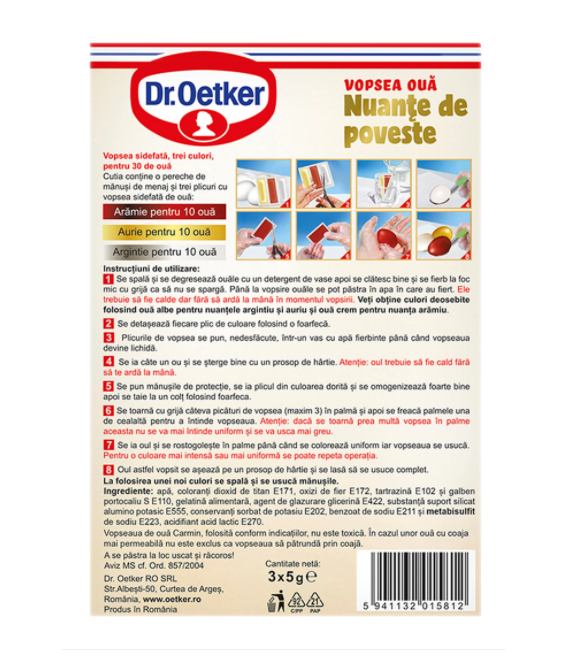 Conditii pastrare si/sau preparare A se pastra la loc uscat si racoros! Se spala si se degreseaza ouale, cu detergent de vase, apoi se clatesc bine si se fierb la la foc mic cu grija ca sa nu se sparga. Pana la vopsire, ouale se pot pastra in apa in care au fiert. Ele trebuie sa fie calde, dar fara sa arda la mana in momentul vopsirii. Veti obtine culori deosebite folosind oua albe pentru nuantele argintiu si auriu si oua crem pentru nuanta aramiu.