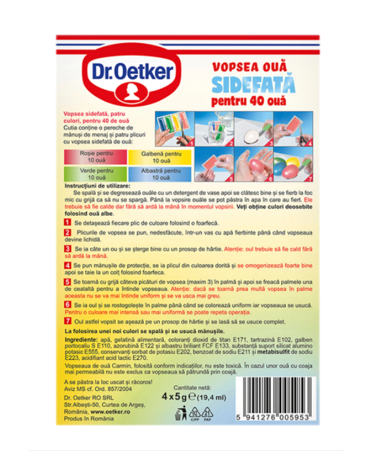 Sugestii de utilizare si/sau precautii (Mentiuni legale) Se detaseaza fiecare plic de culoare folosind o foarfeca. Plicurile de vopsea se pun, nedesfacute, intr-un vas cu apa fierbinte pana cand vopseaua devine lichida. Se ia cate un ou si se sterge bine cu un prosop de hartie. Atentie: oul trebuie sa fie cald fara sa arda la mana. Se pun manusile de protectie, se ia plicul din culoarea dorita si se omogenizeaza foarte bine, apoi se taie la un colt folosind foarfeca. Se toarna cu grija cateva picaturi de vopsea (maxim 3) in palma si apoi se freaca palmele una de cealalta pentru a intinde vopseaua. Atentie: daca se toarna prea multa vopsea in palme, aceasta nu se va mai intinde uniform si se va usca mai greu. Se ia oul si se rostogoleste in palme pana cand se coloreaza uniform, iar vopseaua se usuca. Pentru o culoare mai intensa sau mai uniforma se mai poate repeta operatia. Oul astfel vopsit se aseaza pe un prosop de hartie si se lasa sa se usuce complet. La folosirea unei noi culori se spala si se usuca manusile.