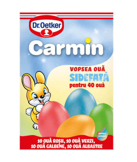 Vopsea sidefata, patru culori, pentru 40 de oua. Cutia contine o pereche de manusi de menaj si patru plicuri cu vopsea sodefata de oua: rosie pentru 10 oua, galbena pentru 10 oua, verde pentru 10 oua, albastra pentru 10 oua, 4x5 g. Vopseaua nu este toxica.