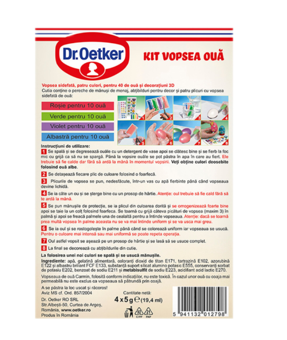 Sugestii de utilizare si/sau precautii (Mentiuni legale) Se detaseaza fiecare plic de culoare folosind o foarfeca. Plicurile de vopsea se pun, nedesfacute, intr-un vas cu apa fierbinte pana cand vopseaua devine lichida. Se ia cate un ou si se sterge bine cu un prosop de hartie. Atentie: oul trebuie sa fie cald fara sa arda la mana. Se pun manusile de protectie, se ia plicul din culoarea dorita si se omogenizeaza foarte bine, apoi se taie la un colt folosind foarfeca. Se toarna cu grija cateva picaturi de vopsea (maxim 3) in palma si apoi se freaca palmele una de cealalta pentru a intinde vopseaua. Atentie: daca se toarna prea multa vopsea in palme, aceasta nu se va mai intinde uniform si se va usca mai greu. Se ia oul si se rostogoleste in palme pana cand se coloreaza uniform, iar vopseaua se usuca. Pentru o culoare mai intensa sau mai uniforma se mai poate repeta operatia. Oul astfel vopsit se aseaza pe un prosop de hartie si se lasa sa se usuce complet. La folosirea unei noi culori se spala si se usuca manusile.